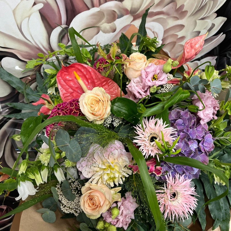 Suur hele ja õhuline lillekimp Carol sobib pidulikumaks tähtpäevaks ja ka koolilõpetajale kingituseks. Lopsakas kimbus on flamingo, preeriakellad, narmasgerberad, roosid, ja rohkelt hooajalist materjali. M suuruses kimbu dm on ca 40cm.
