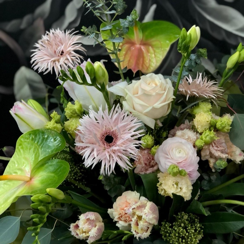Heledates pastelltoonides romantiline rikkalik lillekimp Claudette. Pildlil kimp M suuruses dm-ga ca 40cm